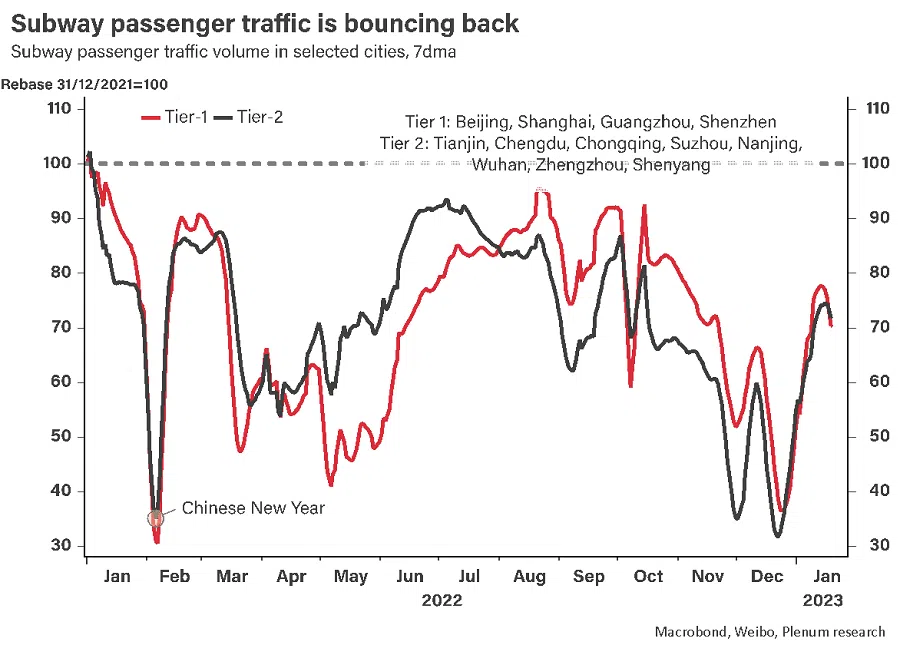 The fact that China seems to have reached the peak of this massive Covid wave in late 2022 is good news for 2023. It is partly because the base effect favours year-on-year growth in 2023 even more. It is also partly because the recovery is taking place earlier and faster than expected. Anecdotal evidence in major cities as well as subway traffic data suggest that the rebound has been very rapid. Some popular tourist destinations are receiving customers at close to 2019 levels.