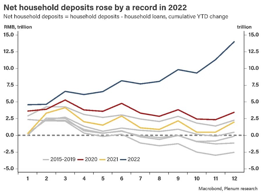Chinese households have the spending power, too. They have saved a lot more in 2022 than in previous years. In 2022, Chinese household deposits rose by over RMB 17 trillion, an all-time high, while their loans only rose by RMB 3.7 trillion, about half of previous years. Net deposits rose by RMB 11 trillion, five times the increase in 2020, which was the previous record.