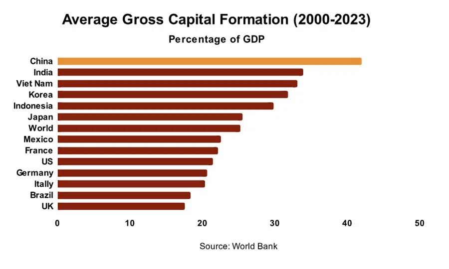 During this period, the global investment rate averaged 25%. And no other country has averaged an investment rate higher than China during this period. The only country to come close to this figure was India, averaging around 38% between 2004 and 2014.
