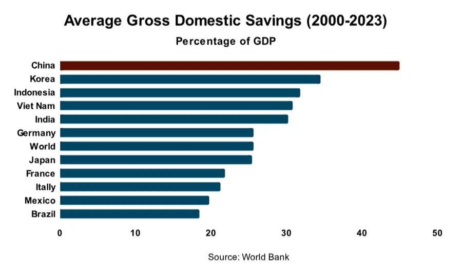In order to ramp up its private consumption significantly, China will also need to tweak its domestic savings rate. Against the global domestic savings rate that averaged 26% between 2000 and 2023, the corresponding figure for China during the same period stood at 46%. Savings and consumption share an inverse relationship. Thus, the only way to amass an extremely high savings rate is to subdue domestic consumption.
