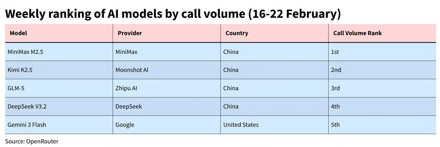 In February 2026, the latest data released by OpenRouter, the world’s largest API aggregation platform for AI models, showed that Chinese AI models have achieved a historic breakthrough in global call volume, surging 127% within three weeks, surpassing the long-leading US for the first time. Chinese AI models also occupy four of the top five spots globally, signalling a clear turning point towards a “strong East, weak West” dynamic in the global AI application landscape.